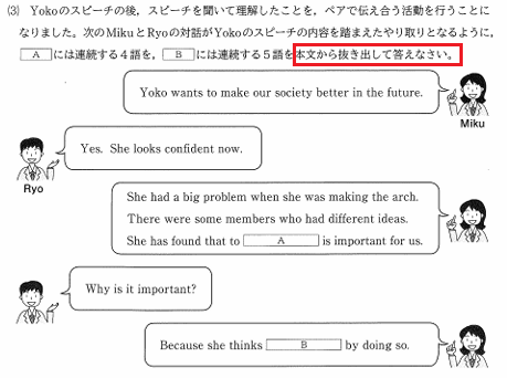 平均点が上がった要因としては、たとえば、下記の図の問題のように従来の英作させるスタイルから本文抜き出しに形式を緩くするなど、出題者側の配慮があったからだと考えられます。