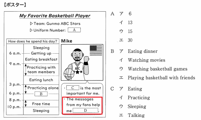 リスニングの最後の問題はDに当てはまる英文を受験者に書かせる問題。主語部分がThe messages from my fansと無生物で長く、helpが動詞であることを見抜かせたうえで、原形不定詞の問題であることに気づけないと解けない。模範解答は(The messages from my fans help me) do my best.