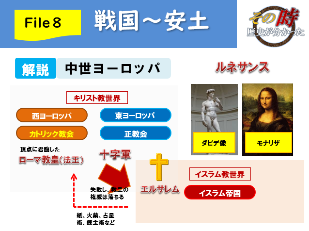 ルネサンスの前、中世の西ヨーロッパのキリスト教(カトリック教会)のトップに君臨していたのがローマ教皇(法王)だ。 当時は「教皇の言うことは絶対!」という神様中心の世界だったんだね。