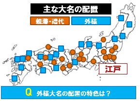 大名の配置に家康の賢さが表れてるんだよね。江戸や京都の近くには親戚や古参の譜代を配置し、信頼できない外様は遠くの地方へ飛ばしたんだ。