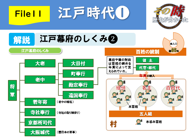 幕府の財政を行ったのが「勘定奉行」で財政は百姓の納める年貢によって支えられていたので、百姓の支配も徹底した。村方三役(組頭・名主・百姓代)を定め、5人のチーム・五人組を組織した。お互いに監視させ、連帯責任を負わせたんだ。たとえば、5人のチームで宿題を1人が忘れたら、全員罰ゲームなんてなったら、そうならないようにお互い見張りあうでしょ? そんなイメージ。