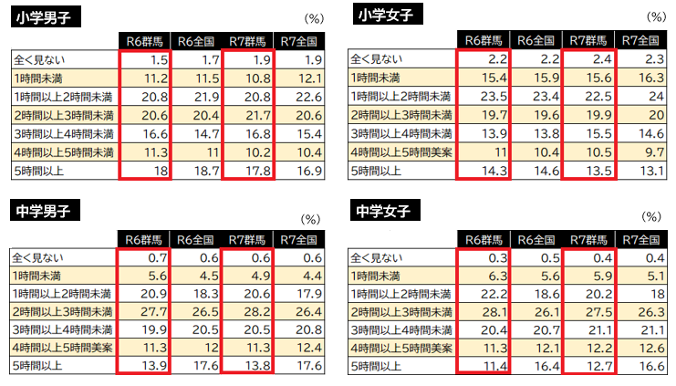実は群馬県の中学生は、「2時間以上」使っている割合が全国平均より低め。