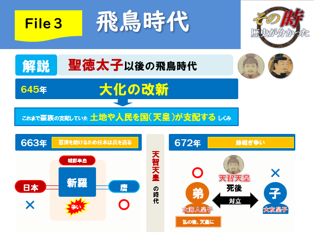 聖徳太子が対等な外交を目指し、大化の改新で「公地・公民」が始まり、最後は「大宝律令」で税金の仕組みまで決まった。