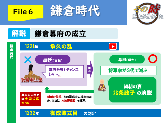 「今がチャンス!政治を天皇の手に取り戻すぞ!」と立ち上がったのが、京都の後鳥羽上皇。これが1221年の承久の乱だ。