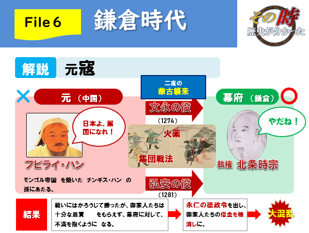 13世紀、世界最強の軍団が日本に迫る。フビライ・ハンの率いる元だ。 元は2回も大軍で北九州に攻めてきた(元寇)。ちなみに1回目を「文永の役」、2回目を「弘安の役」っていうよ。この元寇のときの執権が北条時宗。